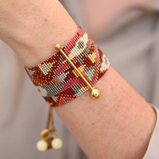 FINE ART BRACELET IN GOLD, BEIGE, BURGUNDY, CORAL AND GUNMETAL