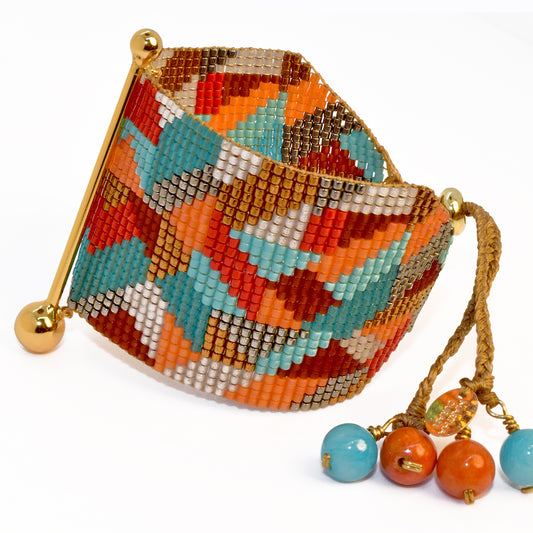 FINE ART BRACELET IN BRONZE, GUNMETAL, TURQUOISE, AQUA, RED, BURGUNDY, ORANGE AND PEARL