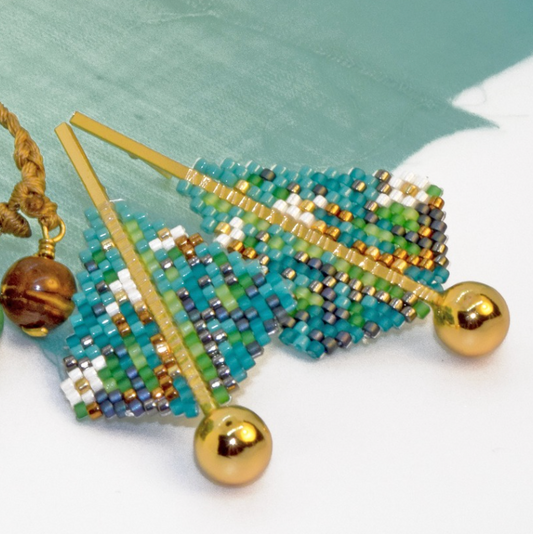 FINE ART EARRINGS IN TURQUOISE, AQUA GREEN, COPPER, GUNMETAL AND WHITE